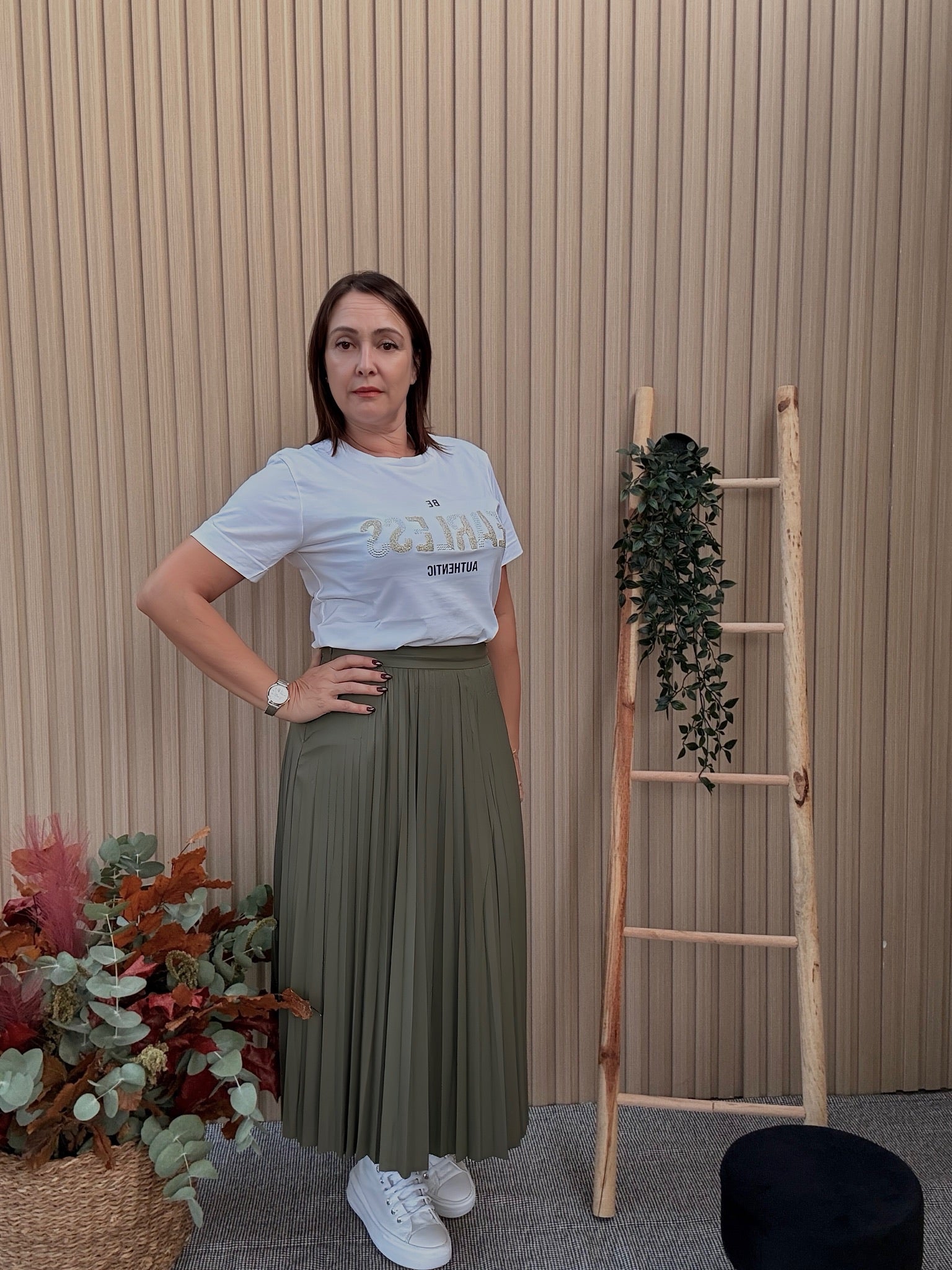 Camiseta blanca de manga corta confeccionada en tejido suave y ligero. Presenta un delicado bordado en tonos dorados en la parte frontal , que añade un toque sofisticado y elegante .