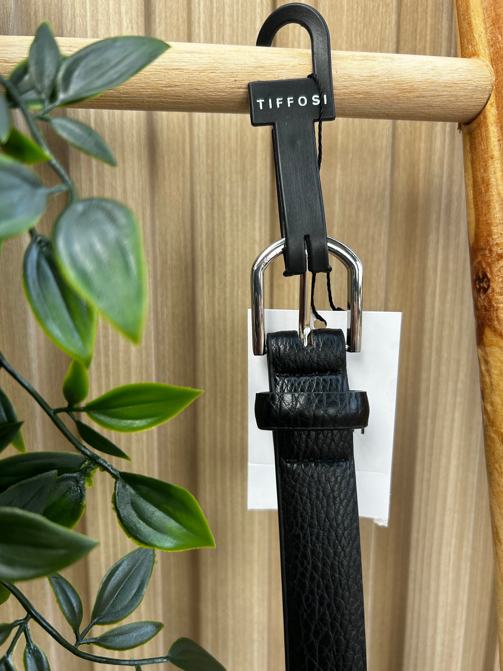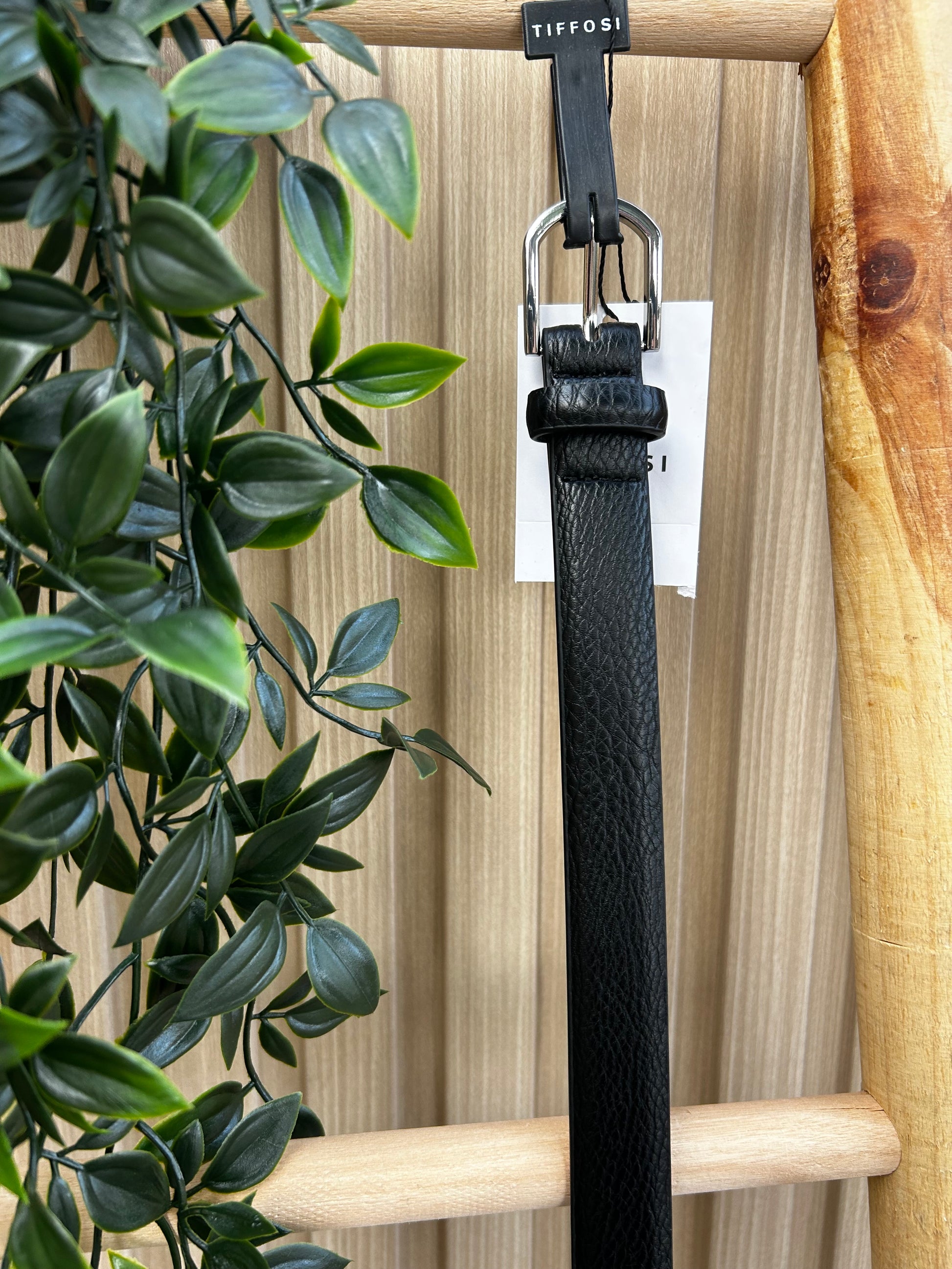 Cinturón negro de corte clásico con hebilla metálica.