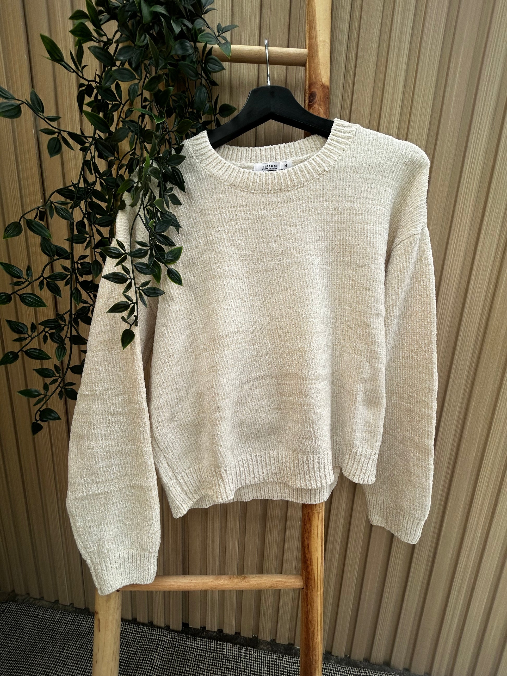 Suéter beige claro confeccionado con un tejido extremadamente suave y agradable al tacto.