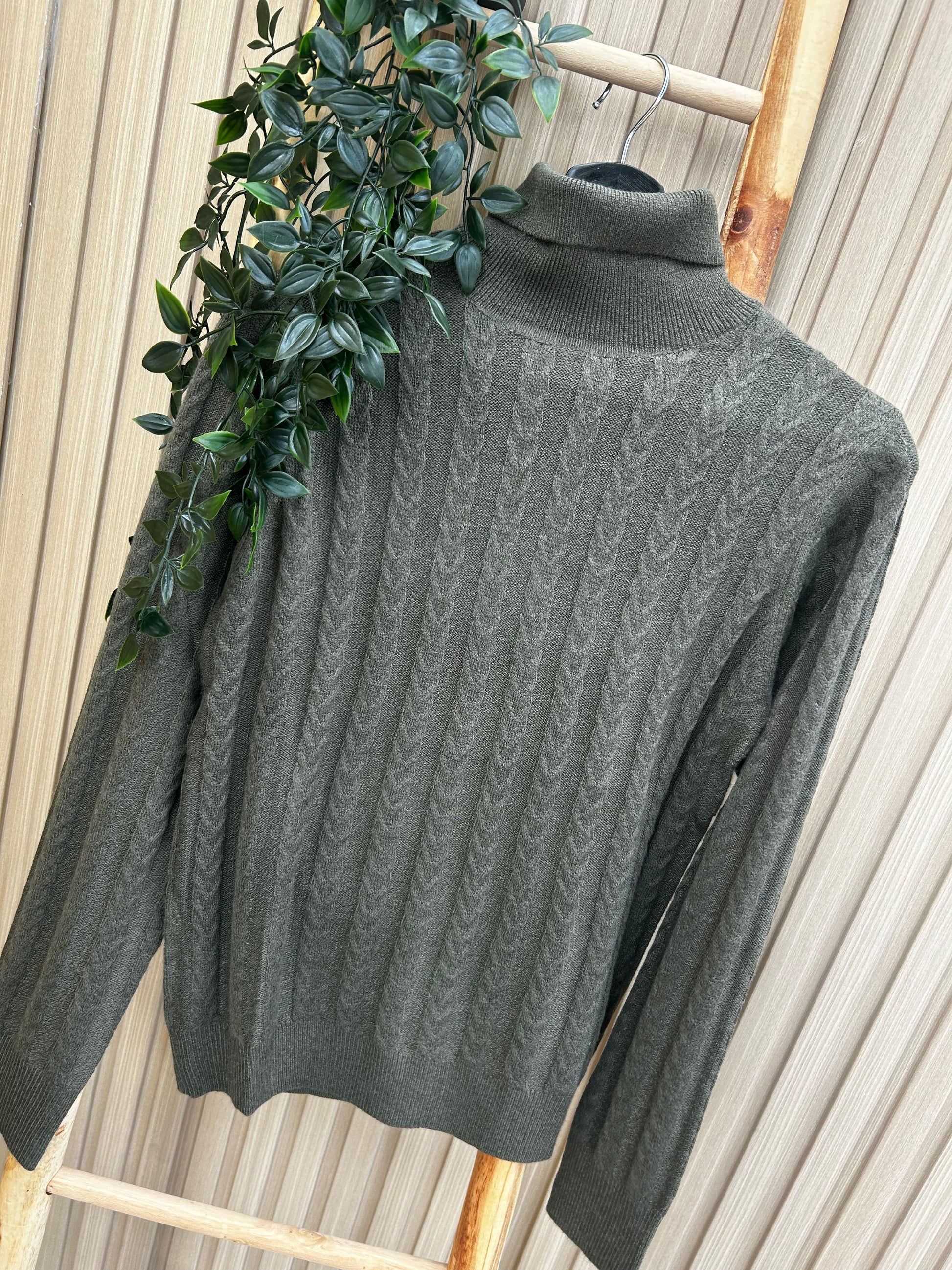 Suéter de cuello vuelto en color verde ,tiene un corte recto y puede usarse en looks casuales con jeans o en conjuntos mas formales debajo de una blazer o abrigo.