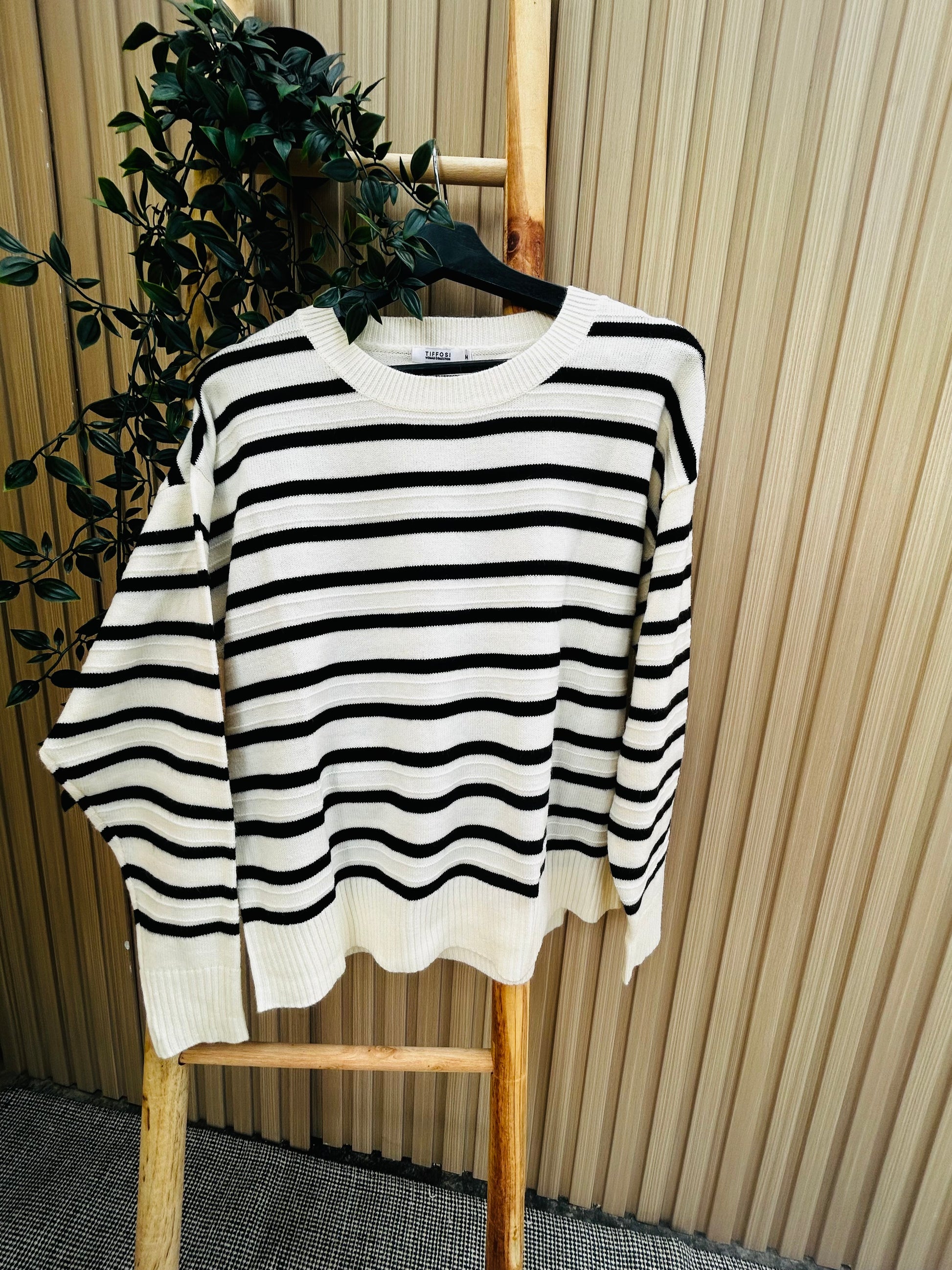 Este suéter a rayas combina estilo y calidez en una sola prenda. Mientras su tejido suave envuelve el cuerpo con confort y elegancia informal.