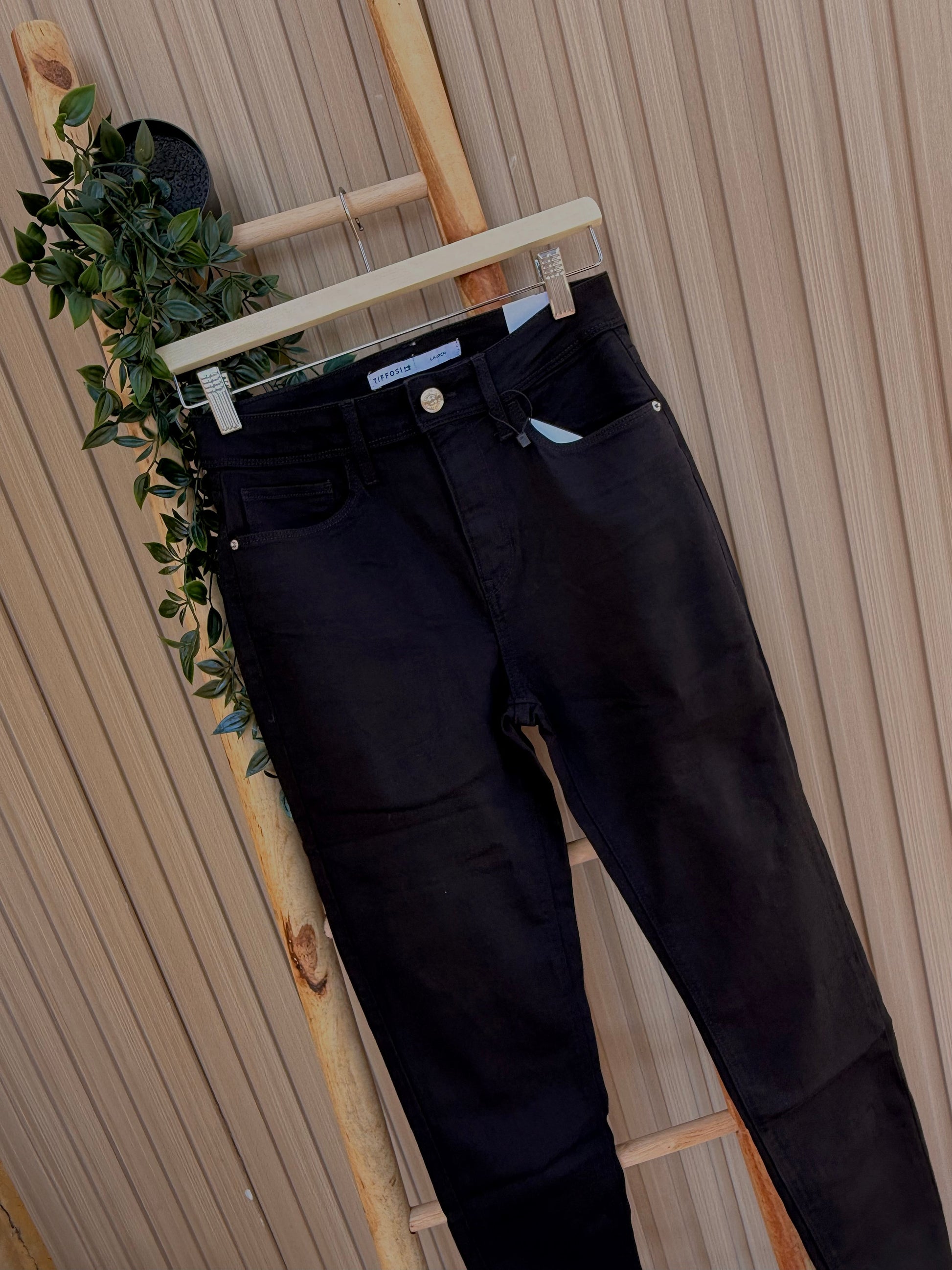 Vaquero negro de corte pitillo,diseño básico y versátil.Confeccionado en tejido denim elástico que se ajusta cómodamente al cuerpo,realzando la figura .