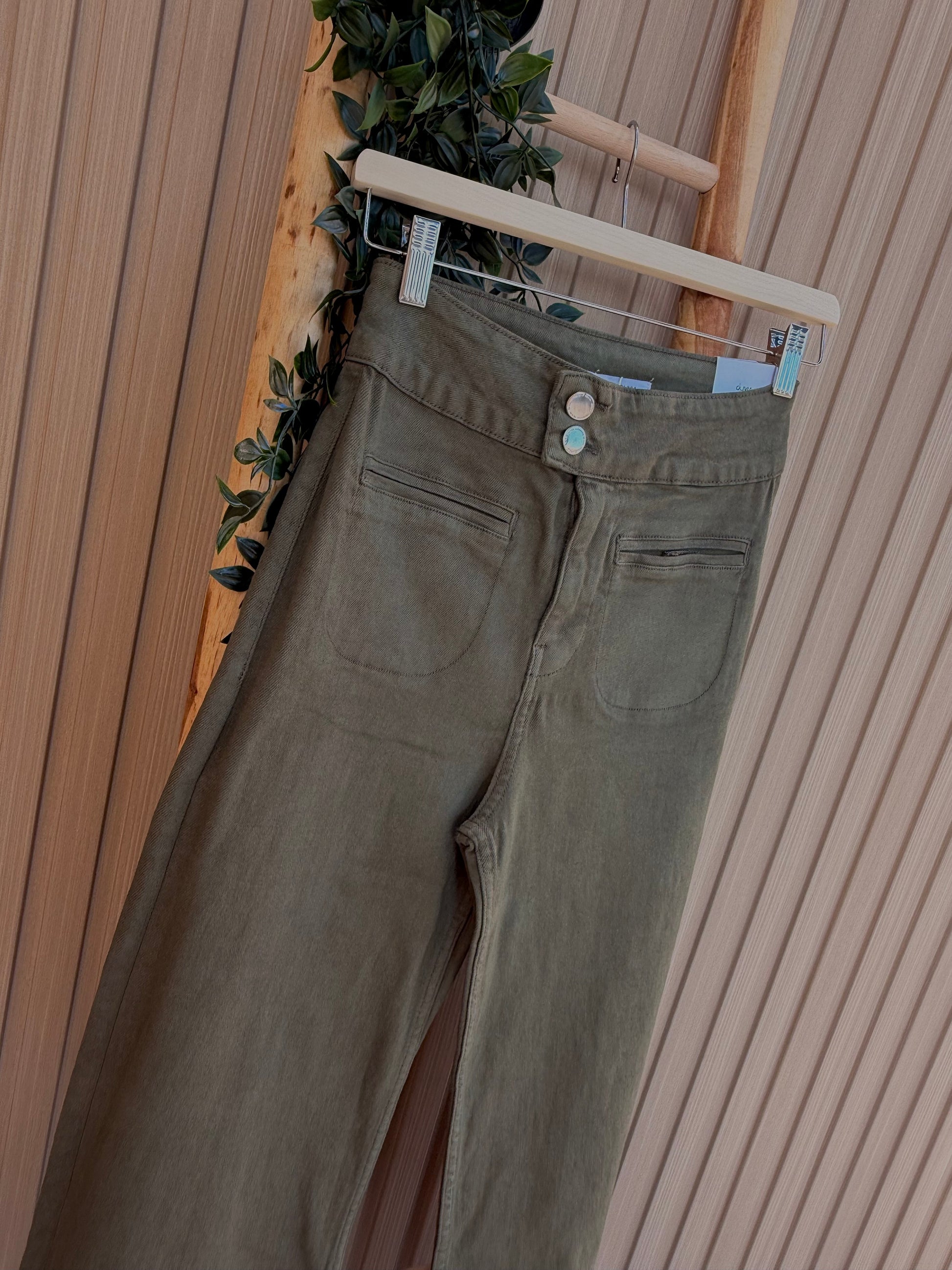 Pantalón vaquero en color verde . Presenta un diseño clásico con dos bolsillos delanteros funcionales y talle alto.